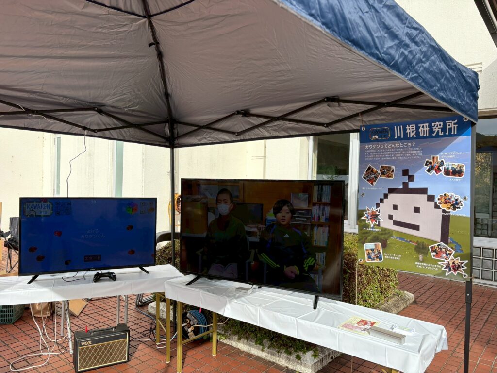 オリジナルキャラクター含むロゴマークのデザイン、ゲームキャラクターデザイン、ゲーム音楽作曲、ゲームのプログラミング、ポスター用にマインクラフトによるかわけんくん制作、サイネージで活動紹介するための動画制作、のぼり用のイラストなど、各研究員がこの日のために準備してきました。自分たちが作ったものを、初めてたくさんの方に見てもらう機会となり、研究員それぞれに感慨深いものがあったと思います。翌週の川研で反省会を行いました。こんな意見が並びました。